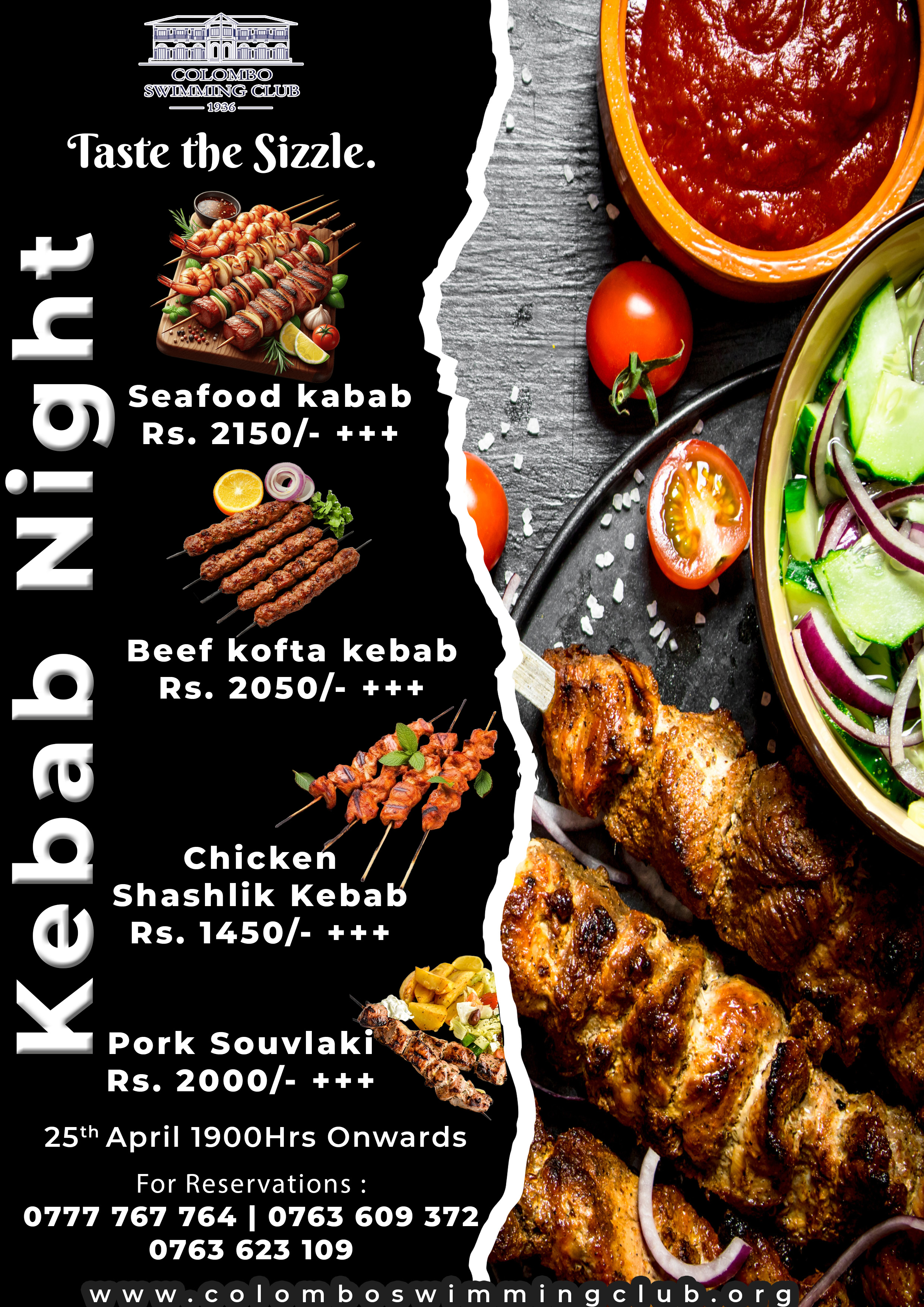 Join us for an unforgettable evening at Colombo Swimming Club as we present Kebab Night — a vibrant culinary celebration inspired by the rich traditions of the Middle East, South Asia, and Central Asia.